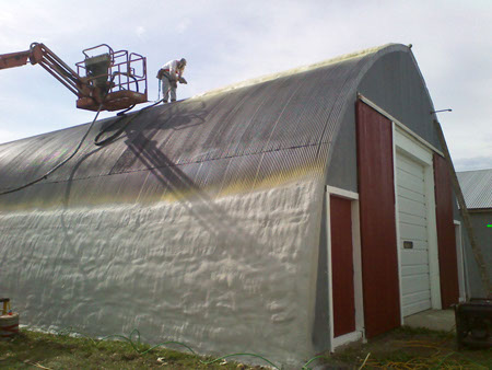 SOLUTION: Apply primer to inhibit further rusting, spray foam exterior to seal leaks and also insulate the building, apply acrylic roof coating for a durable finish.